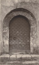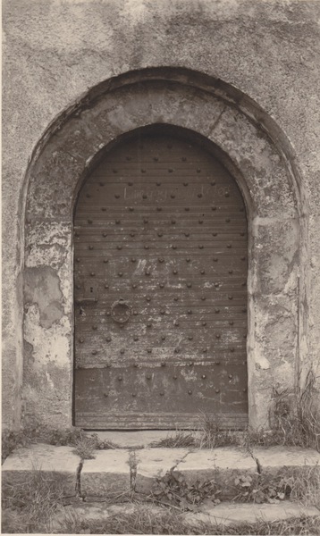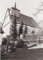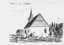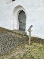 Der Eingang der Alten Kirche besteht aus einer Holztür, welche mit dicken Nägeln beschlagen ist und von innen mit einem dicken Balken verriegelt werden konnte. Dies deutet auf die zeitweilige Verwendung der Kirche als Wehrkirche hin.